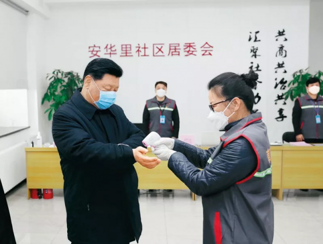 2020年2月10日,中共中央總書(shū)記、國(guó)家主席、中央軍委主席習(xí)近平在北京調(diào)研指導(dǎo)新冠肺炎疫情防控工作。這是習(xí)近平來(lái)到朝陽(yáng)區(qū)安貞街道安華里社區(qū),了解基層一線疫情聯(lián)防聯(lián)控情況。新華社記者 鞠鵬/攝