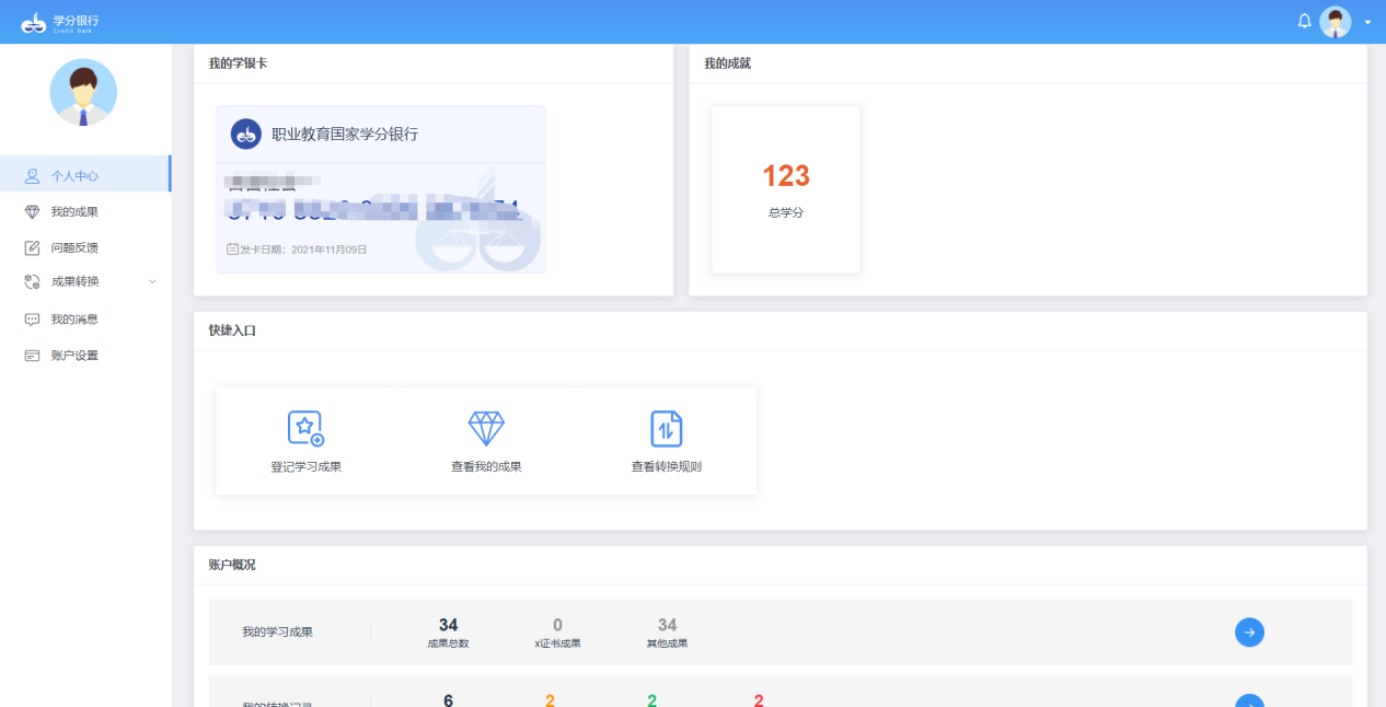 學(xué)分銀行為個(gè)人提供學(xué)習(xí)成果登記、認(rèn)定、存儲(chǔ)、積累、轉(zhuǎn)換等服務(wù)。登錄平臺(tái),首先進(jìn)入個(gè)人中心,可查看我的學(xué)銀卡,我的成就(學(xué)分銀行學(xué)分)、快捷入口、賬戶概況(統(tǒng)計(jì)數(shù)據(jù))。