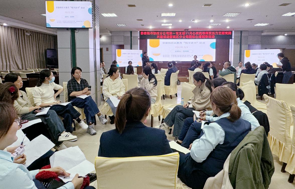 為幫助公司員工抗擊工作及生活壓力,緩解焦慮情緒,11日晚,我校與中國郵政景德鎮(zhèn)分公司在郵政大樓二樓會議室聯(lián)合開展“悅享讀書”抗壓力心理教育活動。此活動有近60余名員工參加。